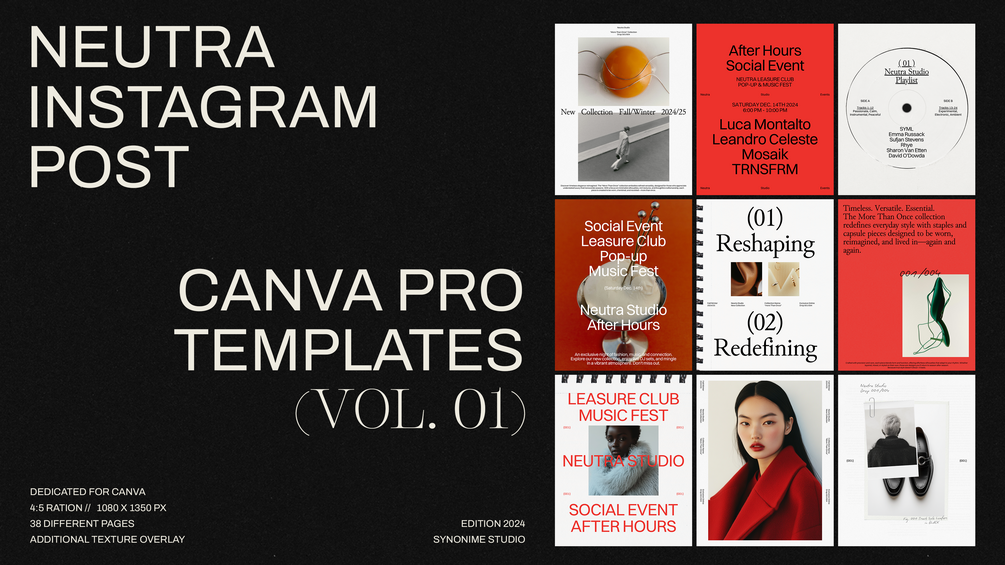 These clean and timeless Canva templates are designed to help you create a cohesive and professional Instagram feed. With 38 customizable pages in a 4:5 ratio (1080 x 1350 px), they’re ideal for brands, creators, and designers looking for simple yet versatile layouts.